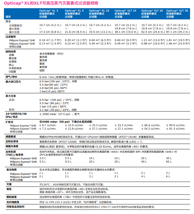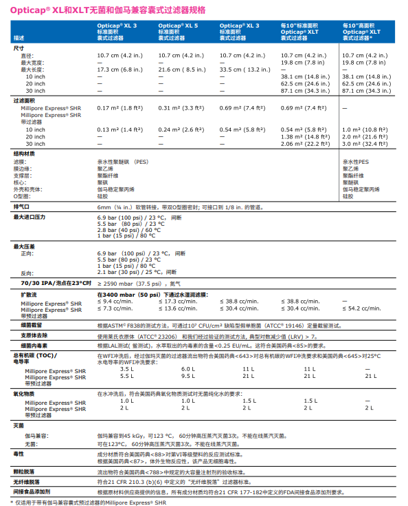 Millipore Express® SHR 過濾器技術(shù)參數(shù):