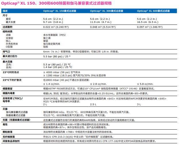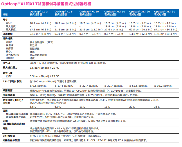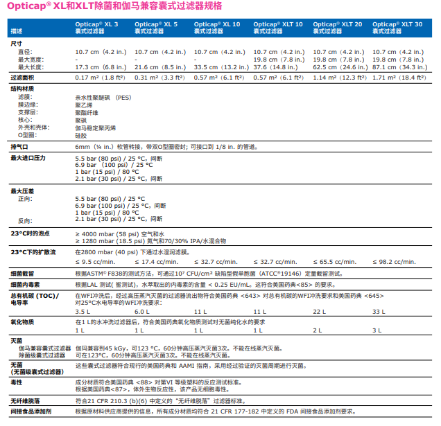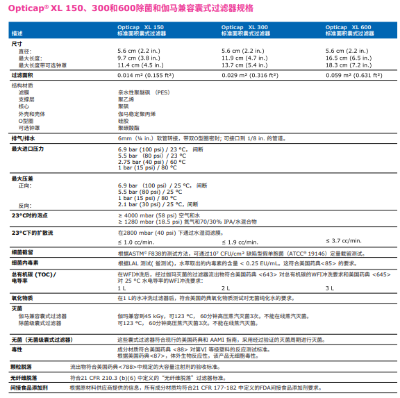 Millipore Express® PHF過濾器的技術(shù)參數(shù):