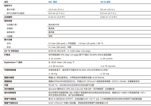 Aervent®濾膜過濾器技術(shù)參數(shù):