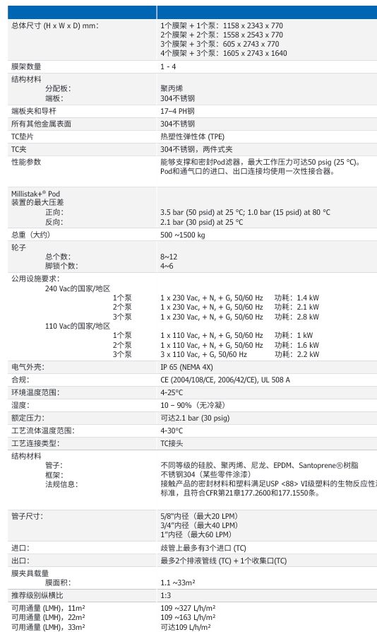 Mobius®FlexReady 大規(guī)模澄清系統(tǒng)包括為該工藝步驟 而特別設計的一次性Flexware® 組件,以及新型分離裝 置和適合生產用的硬件系統(tǒng),從臨床生產到大規(guī)模商業(yè)化 生產都具有無與倫比的操作靈活性。該系統(tǒng)為一次性組件, 避免了維護以及清洗驗證?;趶V泛的支持和服務,專為 大規(guī)模澄清所設計的 Mobius®FlexReady 可以最大程 度提高您的資源產出率并降低風險。用于大規(guī)模澄清的 Mobius® FlexReady 系統(tǒng),設計處理 量可達2000 L(蛋白質濃度為2.5g/L),膜面積為1.1 m² ~ 33 m²(單級過濾),或可達33 / 11 m²(兩級過濾)。
