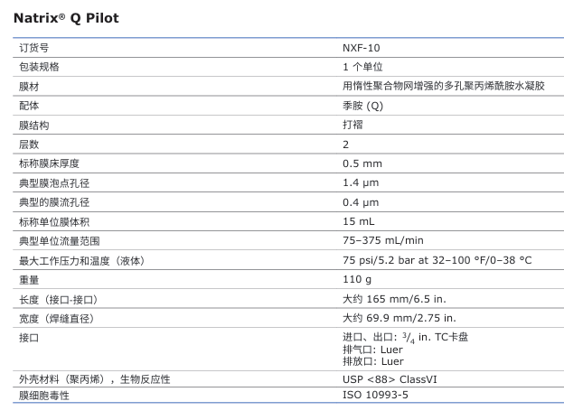 Natrix® Q 陰離子膜是一種多孔聚丙烯酰胺水凝膠,含有高密度的季銨 (Q) 側(cè)鏈結(jié)合基團(tuán),由惰性纖維網(wǎng)物理增強(qiáng)。相互連接的孔結(jié)構(gòu) (標(biāo)稱孔徑,0.4 μm)和高配體密度為蛋白質(zhì)結(jié)合提供了更大的接觸表面 積、高滲透性,并實(shí)現(xiàn)了高通量和高流速下的高載量(某些單抗載量可達(dá)到 10 kg/L),同時(shí)在這些極端操作條件下保持出色的雜質(zhì)清除率。結(jié)合成熟 的 Q 配體技術(shù),這些特性使 Natrix® 膜層析成為商業(yè)規(guī)模層析純化的絕 佳選擇。