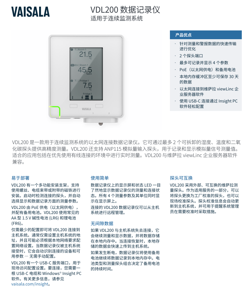 - VDL200 配備了用于監(jiān)測(cè)溫度、相對(duì)濕度和二氧化碳水平的探頭輸入,可跨多種應(yīng)用提供多用途、可擴(kuò)展的監(jiān)測(cè)。