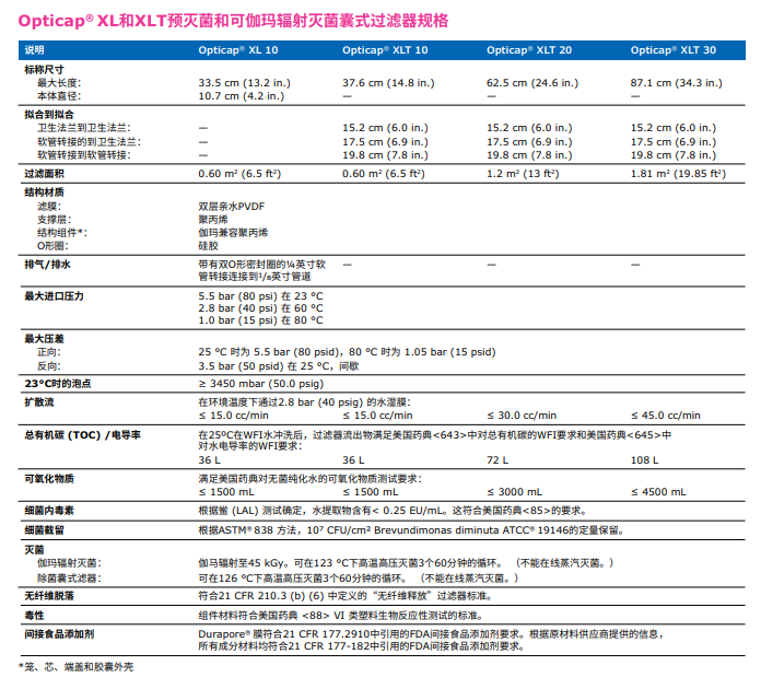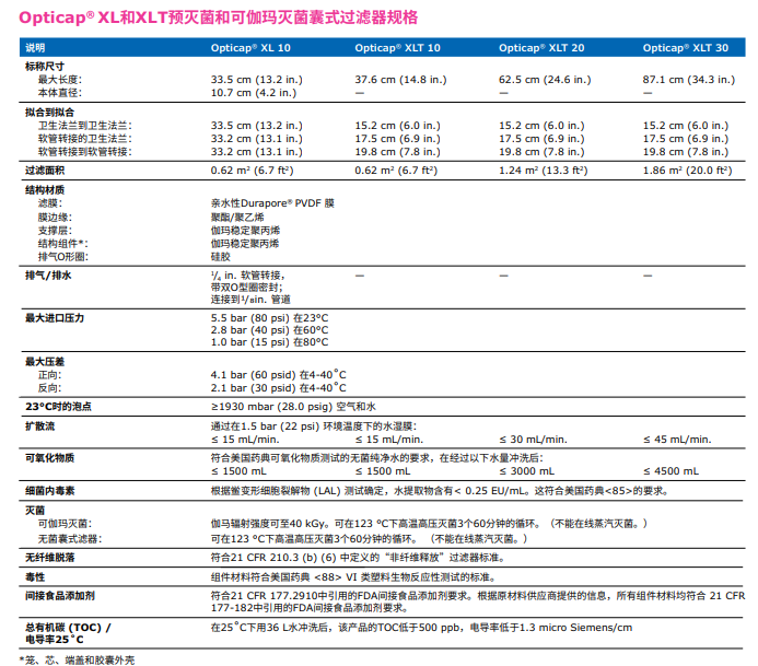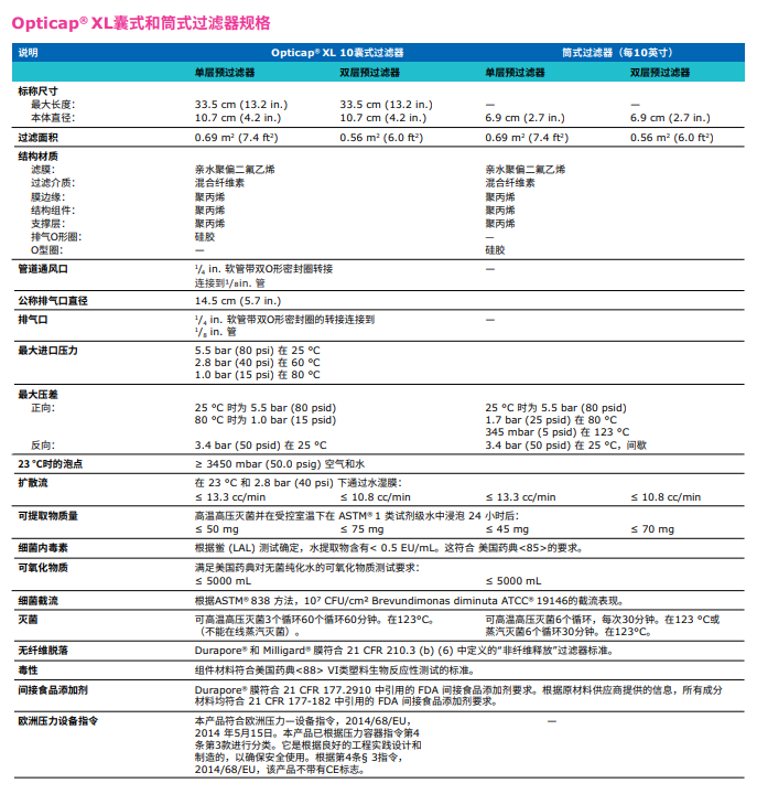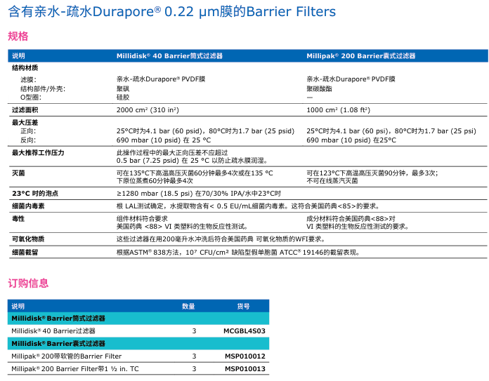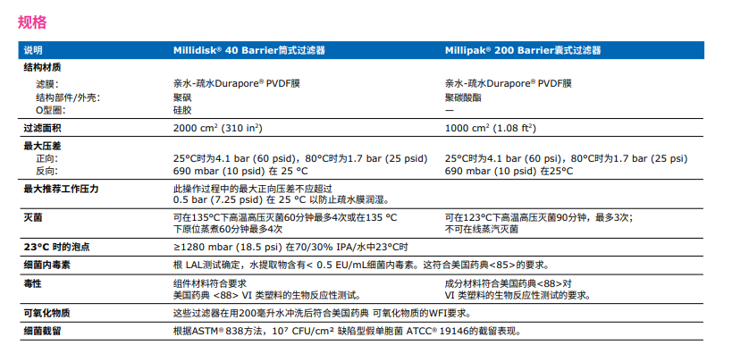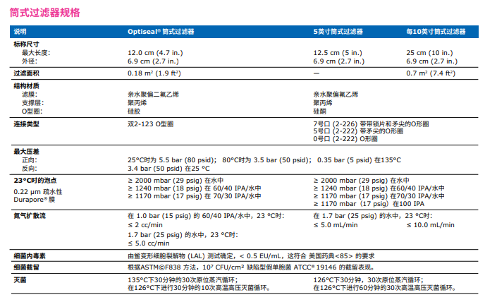 含有Durapore® 0.22 µm親水 -疏水膜的屏障式過濾器的技術(shù)參數(shù):