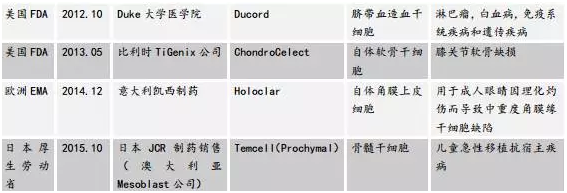 目前國(guó)內(nèi)外已獲批的干細(xì)胞產(chǎn)品如表2: