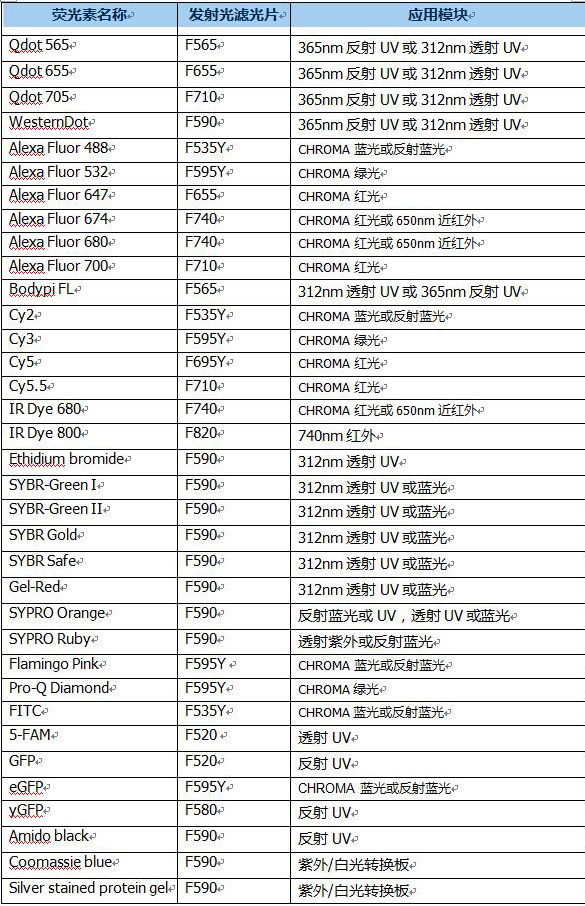 以UVItec多功能凝膠成像系統(tǒng)Alliance Q9 Chroma為例,其多色熒光模塊應(yīng)用列表如下: