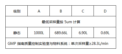 無菌附錄1中也寫明:為確認A級潔凈區(qū)的級別,每個采樣點的采樣量不得少于1立方米。測試方法可參照《ISO14644-1》,而在《GB/T 16292》中也有說明靜態(tài)及動態(tài)的最低采樣量。