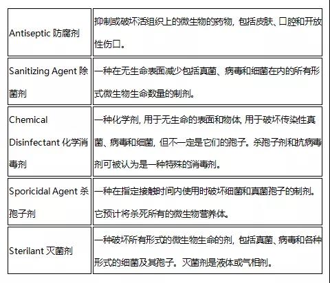 美國(guó)的USP 1072 DISINFECTANTS AND ANTISEPTICS 中就較為復(fù)雜,分為Antiseptic抗菌劑、Sanitizing Agent除菌劑、Chemical Disinfectant化學(xué)消毒劑、Sporicidal Agent殺孢子劑、Sterilant滅菌劑等數(shù)種。