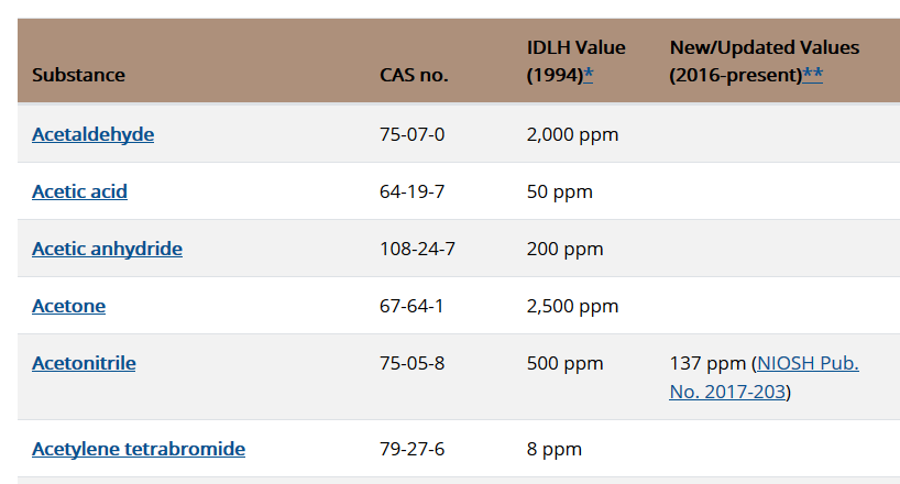 美國(guó)職業(yè)安全與健康研究所列明對(duì)生命健康有不利影響的化學(xué)品的即時(shí)危害值,在CDC網(wǎng)站https://www.cdc.gov/niosh/idlh/intridl4.html可以看到列表,點(diǎn)擊化學(xué)品名稱更有詳細(xì)資料,或用右上角的搜素功能也可輕松查找。