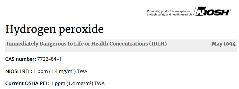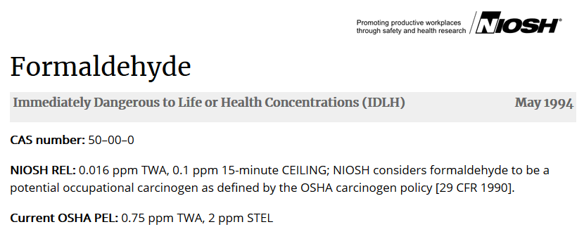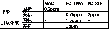可以看到對(duì)甲醛的限制要比過氧化氫高,國(guó)標(biāo)中標(biāo)注甲醛為G1致癌物,美標(biāo)的建議限制值(NIOSH REL)還低至0.016ppm TWA。