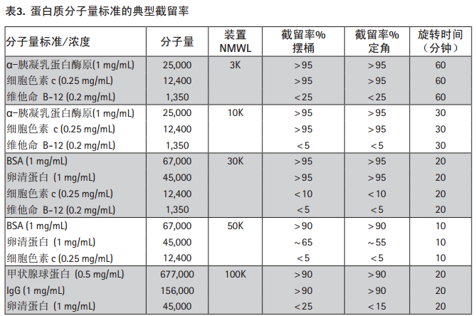 Amicon® Ultra超濾裝置濾膜的特征由標(biāo)稱分子量限值(NMWL)描述,即它們截留超過(guò)一定分子量的分子的能力。分子量接近NMWL的溶質(zhì)可能只有部分被截留。濾膜的截留率取決于溶質(zhì)的分子大小和形狀。在大多數(shù)應(yīng)用中,分子量是用來(lái)評(píng)估截留特性的一個(gè)方便的參數(shù)。Merck Millipore Ltd.建議在濃縮應(yīng)用中使用濾膜NMWL至少比蛋白質(zhì)分子量小兩倍的濾膜。請(qǐng)仔細(xì)查看以下Millipore官方數(shù)據(jù)。